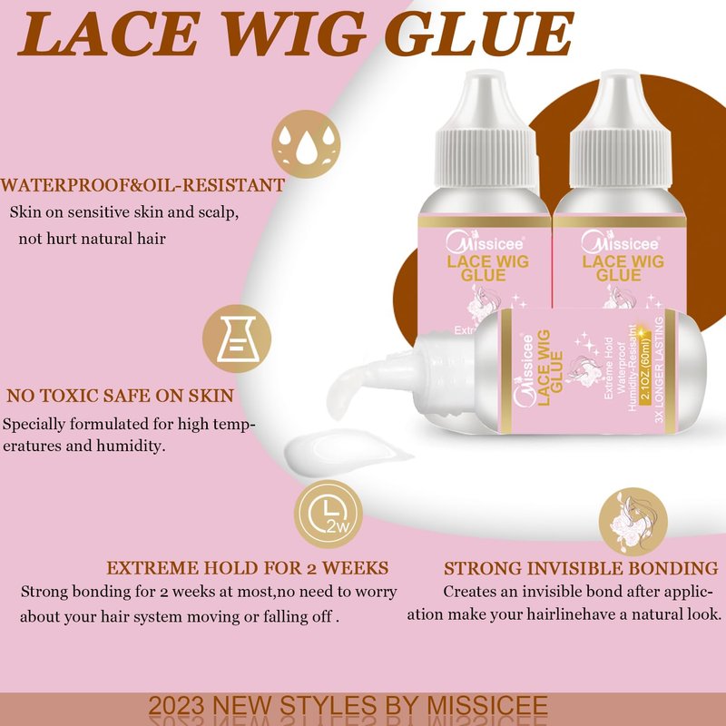 - 【Light Hold Wig Adhesive Glue for Wigs and Hair Systems】 60ml Extra large capacity Lace wig glue is an amazing water-based styling agents, non-toxic lace glue capable of a 2 to 3- week hold. Lightweight formulation dry clear, for strong invisible bonding that looks and feels natural. Formulated to be waterproof, oil resistant and perspiration resistant to make sure your wig stays on and put. For Poly and Lace Hairpiece, Wig, Toupee Systems.