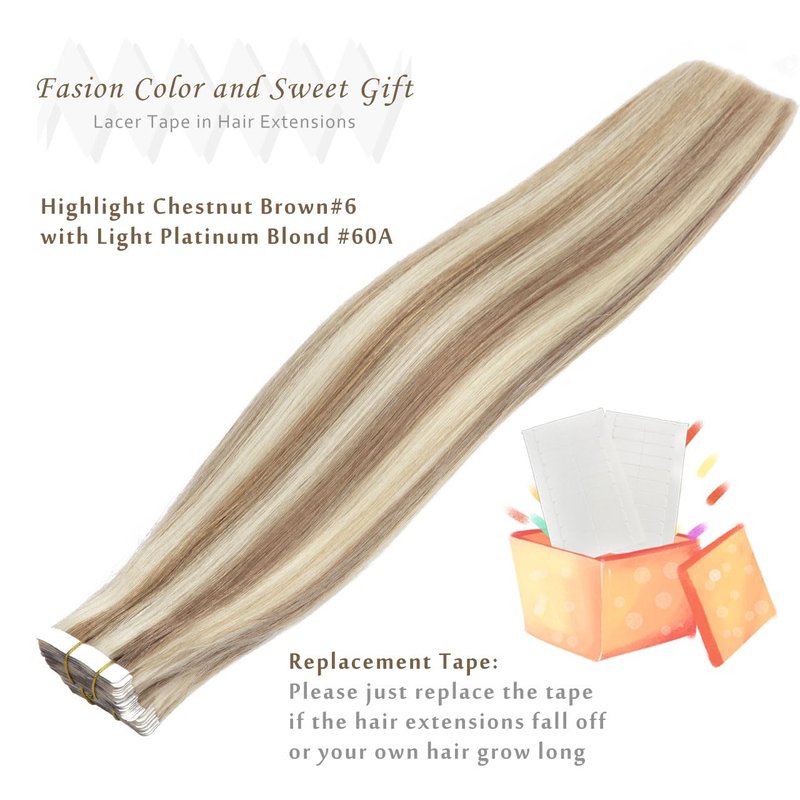 Lacer Hair 14 Inch Tape in Hair Extensions Blonde Highlights #6 Medium Brown Highlighted #60A Platinum Blonde 20pcs 50g Double Sided Tape in Extensions Invisible Human Hair