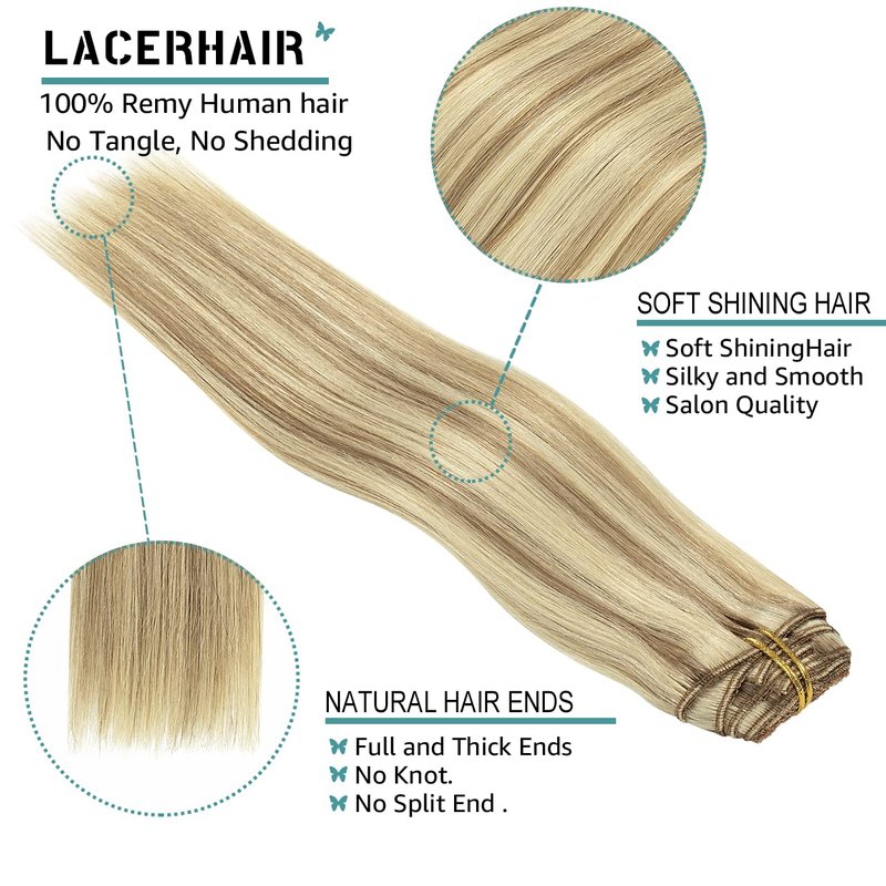 Lacer Hair Clip In Hair Extensions Real Human Hair Light Brown Highlighted Platinum Blonde Color Thick Silky Straight Remy Hair Clip In Extensions 7 Pieces 120 Gram 14 Inch