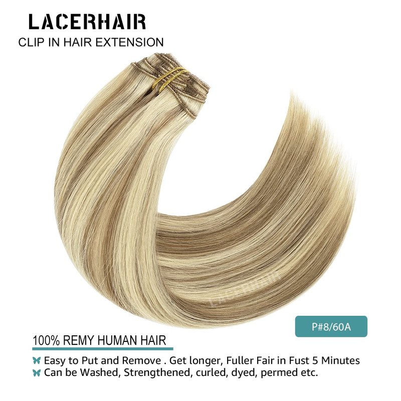 Lacer Hair Clip Ins Hair Extensions Human Virgin Hair Thick Weft Light Brown And Platinum Blonde Highlights Color Metal Clip Salon Quality Straight Clip In Hair Extension 7 Pieces 140 Gram 22 Inch