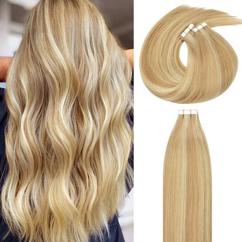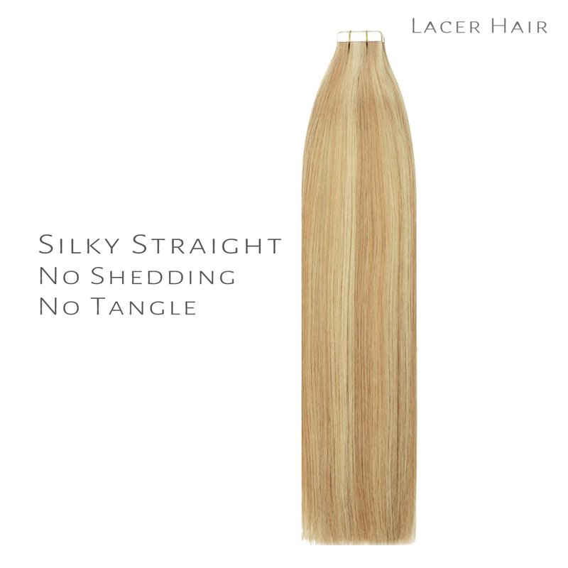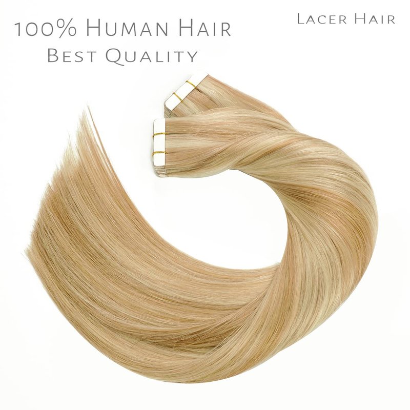 Lacer Hair Extensions Tape in Human Hair Natural Remy Rooted Seamless PU Skin Weft 100% Real Virgin Hair Ombre Golden blonde Color Double Side 50g 20pcs/set 20 inch, P#12/60