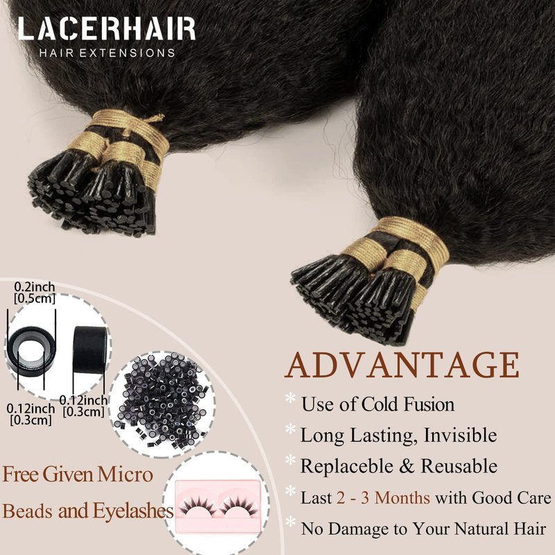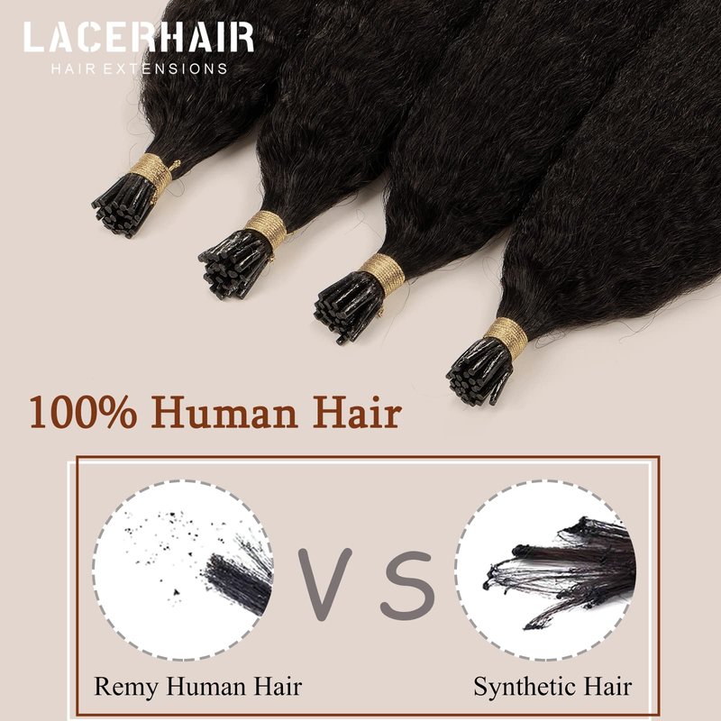 Lacerhair I Tip Hair Extensions Human Hair Kinky Straight Natural Black Color 1B 12 Inch I Tip Hair Extensions Pre Bonded Hair Extensions Micro Links Human Hair for Black Women 50 Strands/Pack 40G