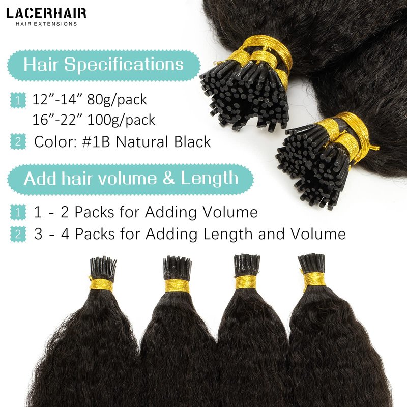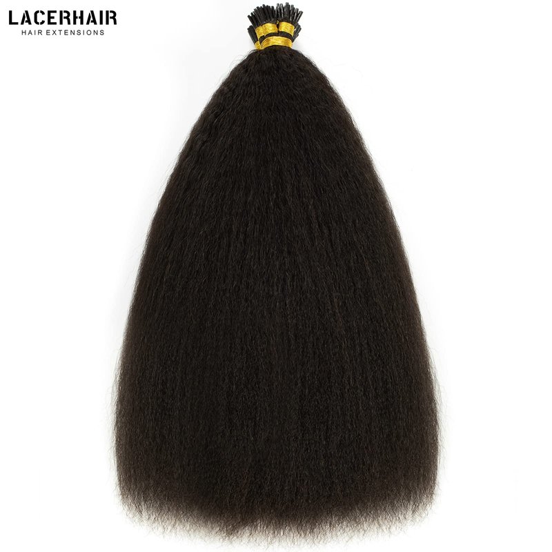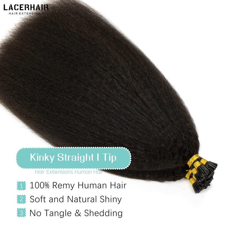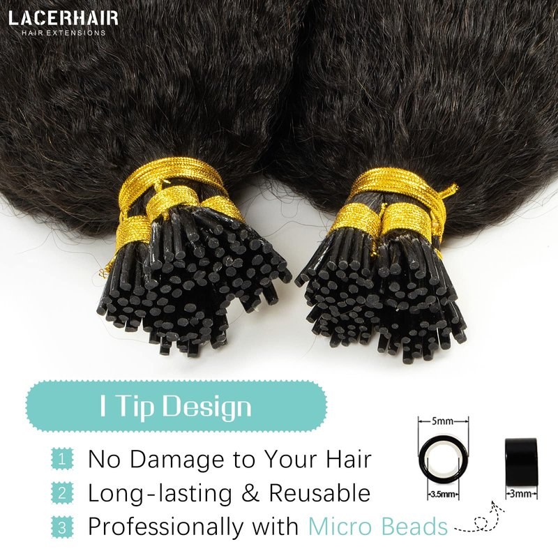Lacerhair Kinky Straight Itip Human Hair Extensions Pre Bonded Coarse Yaki Virgin Natural Black Microlinks I Tip Hair Extensions Real Human Hair for Black People Cold Fusion 12 Inch 100 Strands 80g