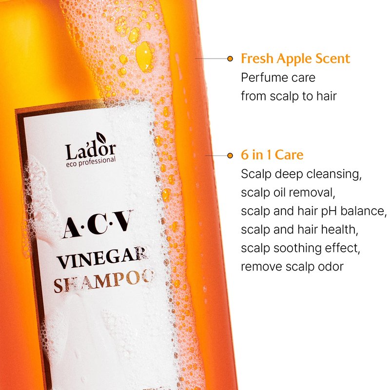 LA'DOR ACV Apple Cider Vinegar Shampoo is a pH-balanced hair care marvel, offering a multitude of benefits to revive your hair and scalp. Its unique pH level closely aligns with your hair, making it perfect for maintaining overall hair and scalp health. This shampoo excels in providing a deep scalp cleanse, eliminating unwanted odors caused by oil and residue buildup. Particularly beneficial for those with oily or greasy hair, it maintains balance and shine while effectively treating dandruff. The magic behind this shampoo lies in its Multi-RX Pro ingredients, a powerhouse of nutrients that nourish and strengthen your hair from the roots, leaving it healthier and glossier. What truly sets it apart is its dedication to clean hair care. Proudly sulfate-free, silicone-free, and paraben-free, it ensures your hair and scalp benefit without exposure to harmful chemicals. For dull, lackluster hair, this shampoo works wonders, exfoliating your scalp to remove excess oil, sebum, and dandruff residue. It also calms and soothes irritated scalps with tea tree extract, leaving a refreshing aftereffect. While suitable for all hair types, it shines those with oily hair and scalp issues like itchiness and peeling. Its unique cooling sensation reduces scalp irritation, offering comfort. But the goodness doesn't stop there; the formula is vegan and gentle, not only cleansing your hair but strengthening your scalp, promoting healthier hair growth. This fantastic product features a delightful blend of extracts, including apple, vinegar, grape, avocado, vitamin tree, sugar cane, tea tree, olive, carrot, plum, raspberry, hibiscus, loofa cucumber, kiwi, lemon, and baobab seed. These ingredients work harmoniously to revive glossiness and a healthy sheen. LA'DOR ACV Apple Cider Vinegar Shampoo is your answer for beautiful, healthy hair, with its pH balance, nutrient-rich formula, and commitment to clean, sustainable hair care.