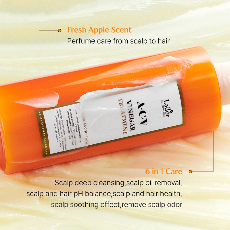 LA'DOR Apple Cider Vinegar Treatment is a pH-balanced hair care marvel, offering a multitude of benefits to revive your hair and scalp. Its unique pH level closely aligns with your hair, making it perfect for maintaining overall hair and scalp health. This treatment excels in providing a deep scalp cleanse, eliminating unwanted odors caused by oil and residue buildup. Particularly beneficial for those with oily or greasy hair, it maintains balance and shine while effectively treating dandruff. What truly sets it apart is its dedication to clean hair care. Proudly sulfate-free, silicone-free, and paraben-free, it ensures your hair and scalp benefit without exposure to harmful chemicals. For dull, lackluster hair, this treatment works wonders, exfoliating your scalp to remove excess oil, sebum, and dandruff residue. It also calms and soothes irritated scalps with tea tree extract, leaving a refreshing aftereffect. While suitable for all hair types, it shines especially for those with oily hair and scalp issues like itchiness and peeling. Its unique cooling sensation reduces scalp irritation, offering comfort. The magic behind this treatment lies in its vegan and gentle formula that nourishes and strengthens your hair from the roots, not only cleansing your hair but strengthening your scalp, promoting healthier and glossier hair growth. This fantastic product features a delightful blend 50,000ppm Vinegar, 40,000ppm Apple Extract, and various naturally-derived extracts including grape, avocado, vitamin tree, sugar cane, tea tree, olive, carrot, plum, raspberry, hibiscus, loofa cucumber, kiwi, lemon, and baobab seed, as well as plant oils from camellia, grape, and argan. These ingredients work harmoniously to revive glossiness and a healthy sheen. LA'DOR Apple Cider Vinegar Treatment is your answer for beautiful, healthy hair, with its pH balance, nutrient-rich formula, and commitment to clean, sustainable hair care. (1936)