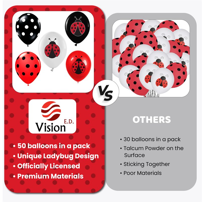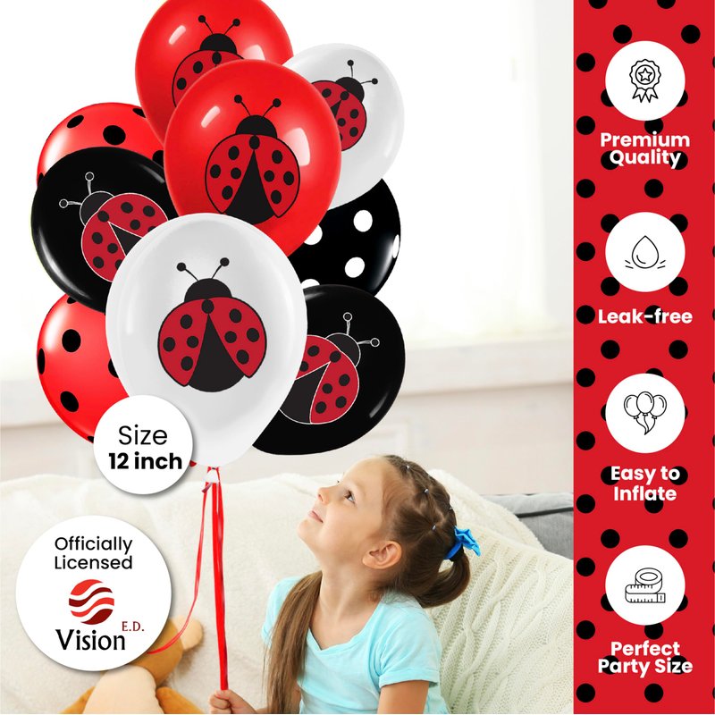Ladybug 12" Birthday Party Balloons 50 Pcs | Red Black Polka Dots Ladybug Design Premium Latex Balloons | Perfect for Ladybug Birthday Party Decorations and Baby Shower Decorations by Vision E.D.