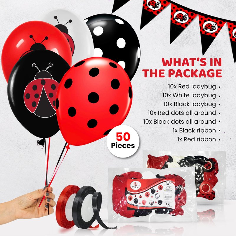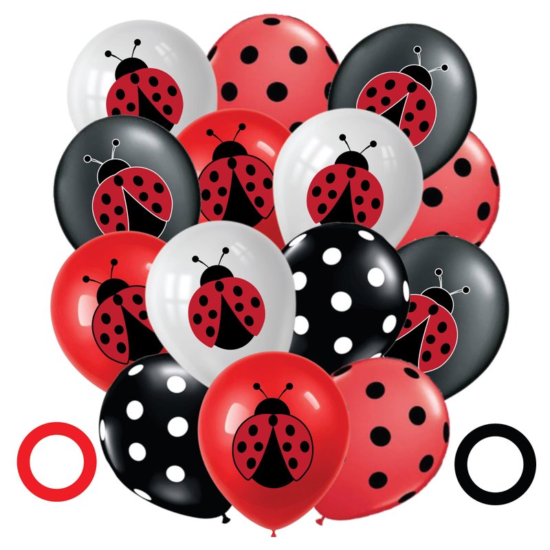 - Assorted Ladybug Themed Balloons - Pack of 50 includes 10 red ladybug, 10 white ladybug, 10 black ladybug, 10 red dots, and 10 black dots all-around balloons, perfect for adding a thematic touch to Miraculous birthday decorations.