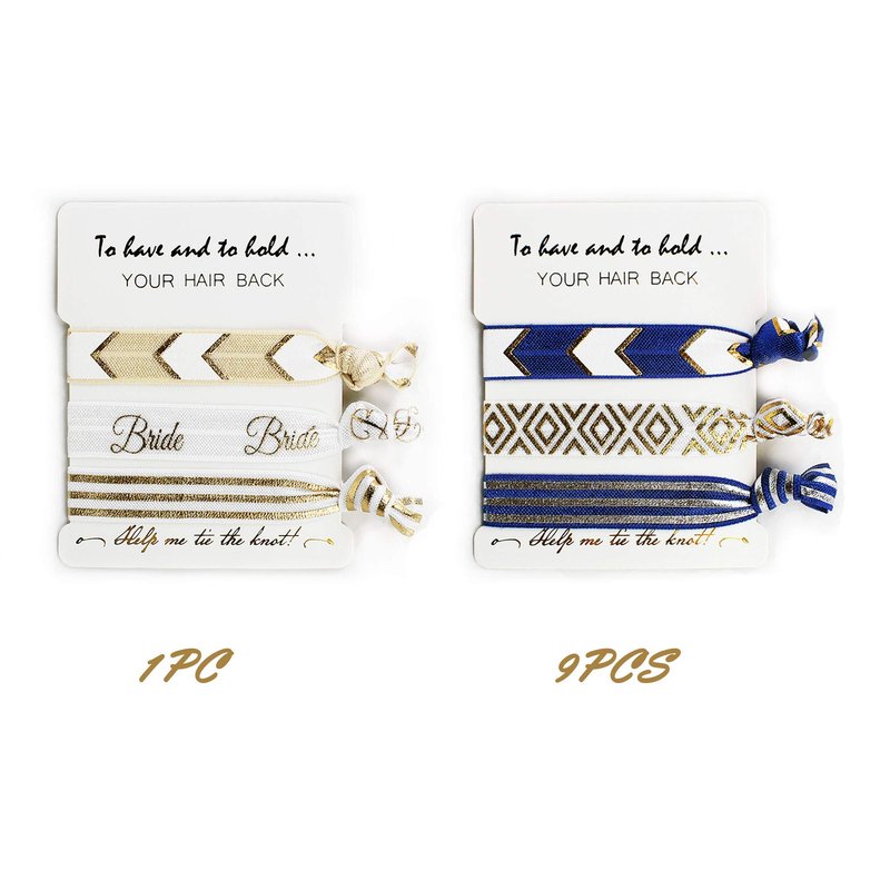 - BRIDE TRIBE GIFTS -Total 10 packs hair ties, 1 white pack for bride, 9 pink pack for bride tribe. There are 3 different hair ties for each pack.