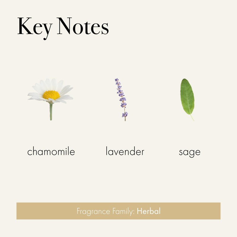 - SCENT - Chamomile Lavender features lavender with warm & enveloping bergamot. Calming chamomile melts into a heart of eucalyptus to create a feeling of well-being. Smoky patchouli is enhanced by hints of sage & rosemary for a quiet, relaxing finish.