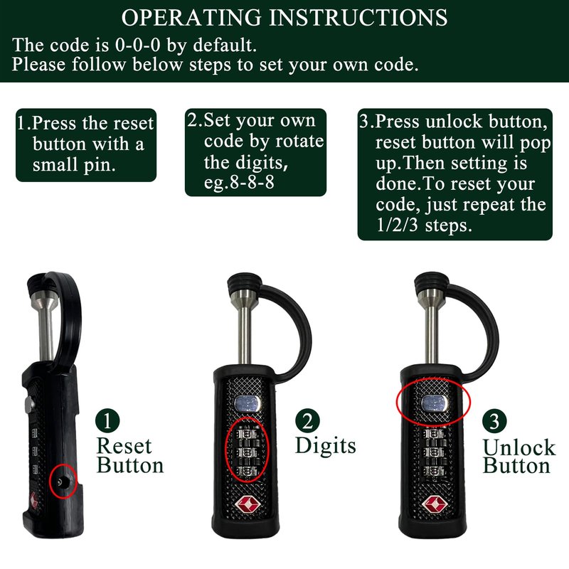 - Easy-to-Use: TSA locks have a resettable 3 dial combination that allows users to set their own unique combination, making it easy to remember and quick to unlock when needed.