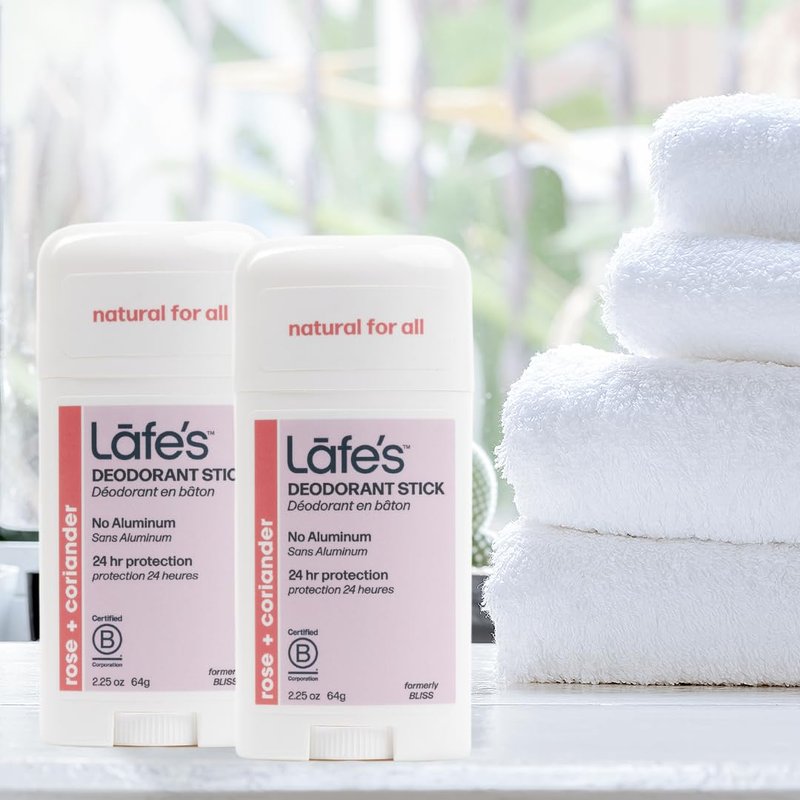 - 2.25 OUNCE DEODORANT STICK - ROSE & CORIANDER - FORMERLY BLISS- Lafe's Rose & Coriander Twist-Stick Deodorant is baking soda free, propylene glycol free, and aluminum free and scented with rose and iris essential oils, never any toxins.
