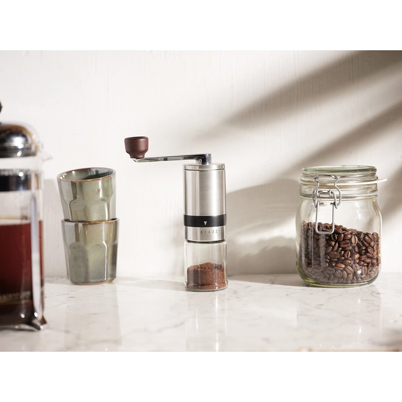 - FOOD SAFE HIGH QUALITY MATERIALS | We have sourced the highest quality materials available for our burr coffee grinder. Brushed stainless steel body and glass coffee ground catch jar, polished stainless steel hand coffe grinder manual crank handle accented with a wooden knob, plus a virtually bulletproof ceramic conical burr ensuring a precise grind that won't dull and will stand the test of time.