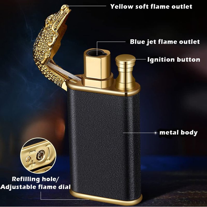 - Dual Flame Function: Built with Soft/ Jet Torch Flame Changeable function. This gas lighter integrates 2 ignition modes, press the button to blue jet flame and release the button the yellow soft flame will spew from the crocodile's mouth. Easy change and simple operation.