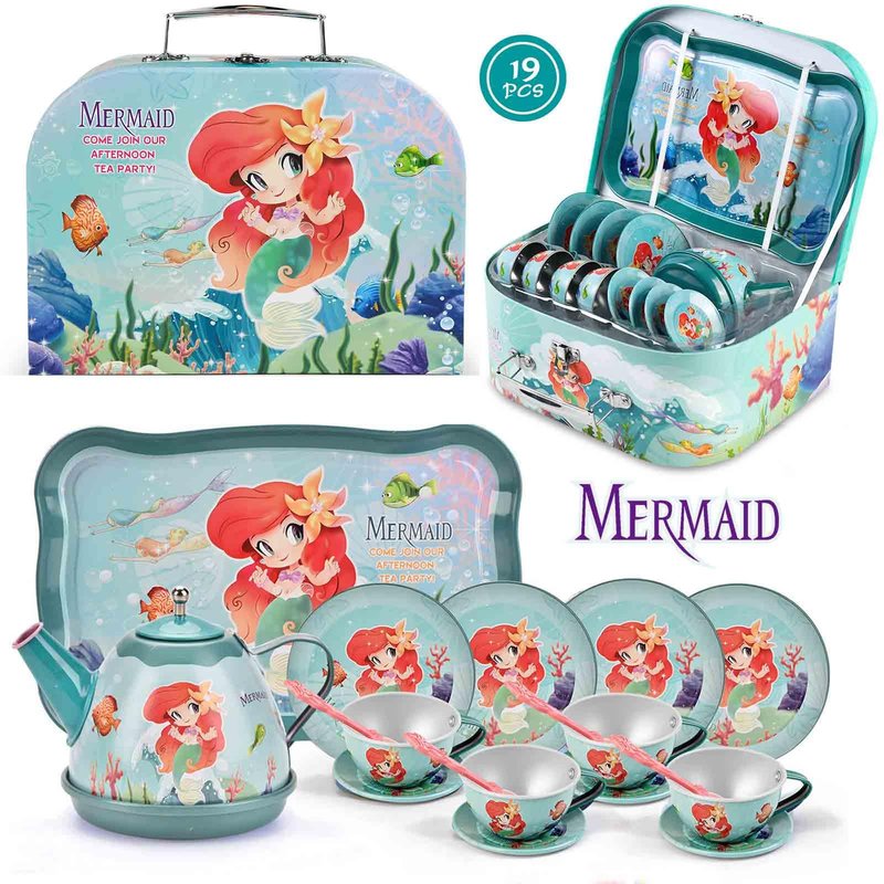 - INSPIRING IMAGINATION: This adorable toy tin set is designed to encourage children to use their imagination and improve their creativity and social skills. The tea set is decorated with a magical mermaid, colorful fishes, and other delightful sea creatures, sure to inspire your little ones.