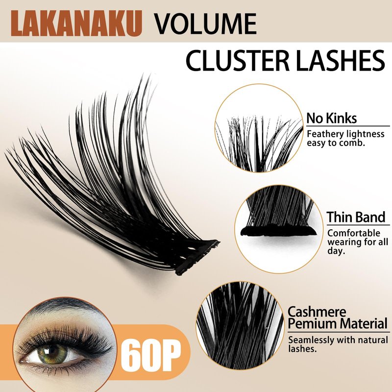 - 【Suitable to wear】LAKANAKU wispy lash clusters have thin and superfine band, lightweight and soft lashes that after wearing it you can hardly feel the fluffy lash clusters and it doesn't block your vision. When you blink, the lash band won't sting your eyelid area, and it's comfortable to wear all day long and easy to use even for beginner lash users.