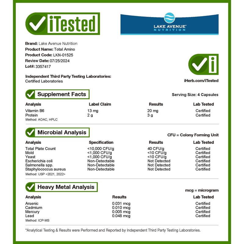 Lake Avenue Nutrition Total Amino with 20 Amino Acids Supports Muscle Health & Development* Formulated Without: GMOs or Gluten Produced in a GMP Facility