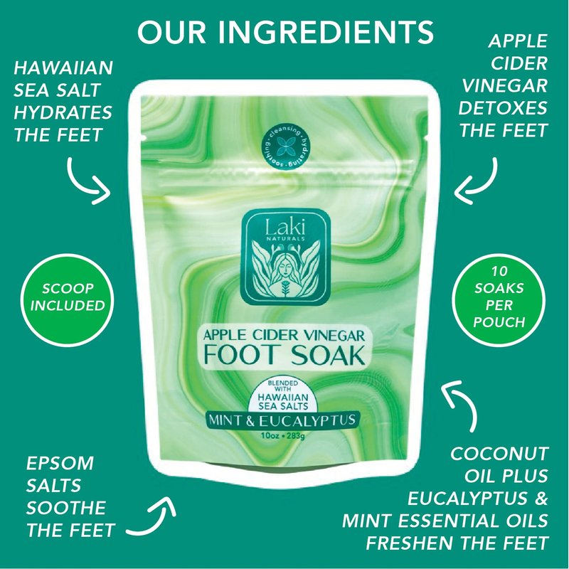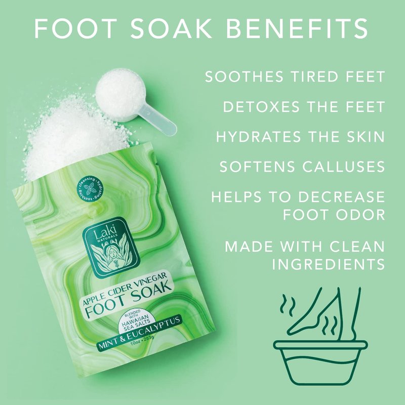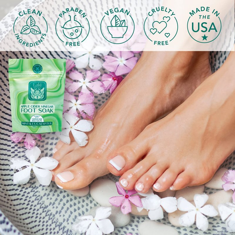 - ACV FOOT SOAK: Treat your feet with Laki Naturals Epsom salt and apple cider vinegar foot soak. Specially formulated to soothe, detox, clean, and hydrate tired achy feet.