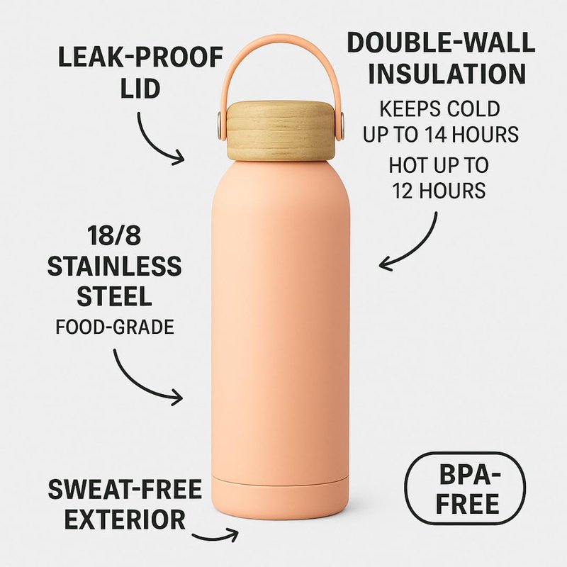 Stay hydrated in style with our premium insulated stainless steel thermos flask, available in 17oz (500ml) and 25oz (750ml) sizes. Designed for performance and sustainability, this vacuum insulated water bottle keeps your drinks hot for up to 12 hours and cold for up to 24 hours – perfect for long days at work, gym sessions, outdoor hikes, or daily commutes. Crafted from high-quality 18/8 stainless steel, it’s built to resist rust, stains, and odors while staying completely BPA-free and eco-friendly. The bamboo lid with a silicone seal ensures a leakproof experience, while the modern matte finish and minimalist style complement any lifestyle. Whether you're a coffee lover, tea drinker, or fitness enthusiast, this reusable insulated water bottle is your go-to thermos flask for hot and cold beverages. Upgrade your daily hydration and reduce single-use plastic with this durable, stylish bottle.