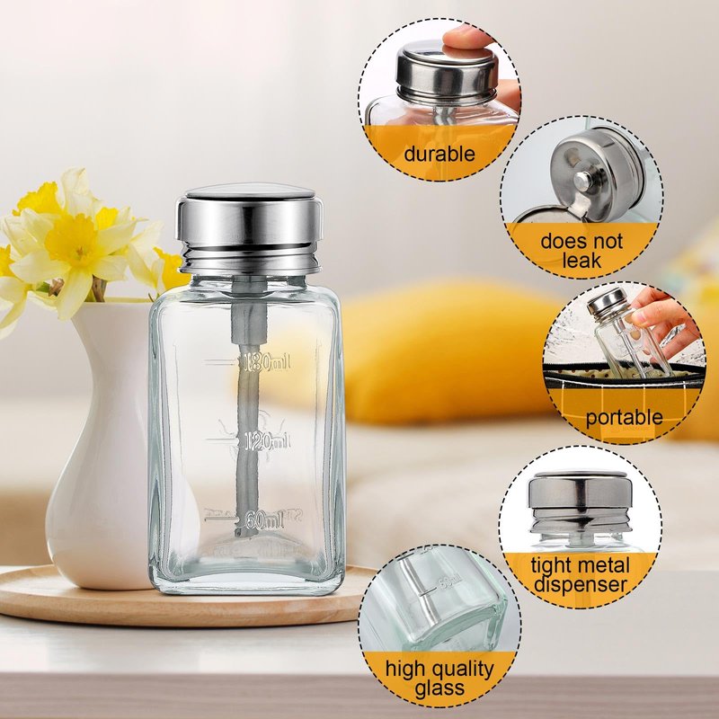 - Solid and Reliable: the clear dispenser bottles made with glass bottles and metal covers, our pump dispenser bottles are solid and reliable; You don't need to worry about the leakage, and they will not spill easily