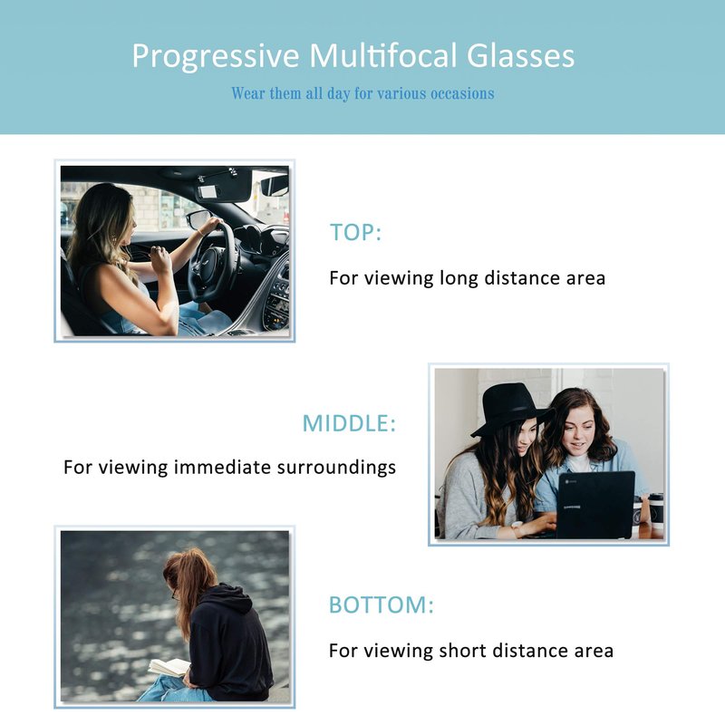 - [Three Levels of Vision]Progressive multifocus glasses for all your need. Top part is half-power magnification for walking, shopping. The middle part is slightly reduced power magnification for working on computer, watching TV, etc. The bottom part of the lens is full-power magnification, then used for nearly distance reading. It means that you can wear the glasses anytime and anywhere.