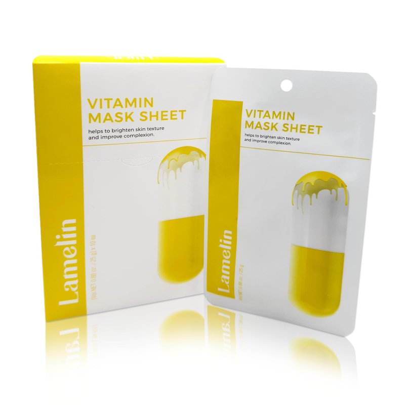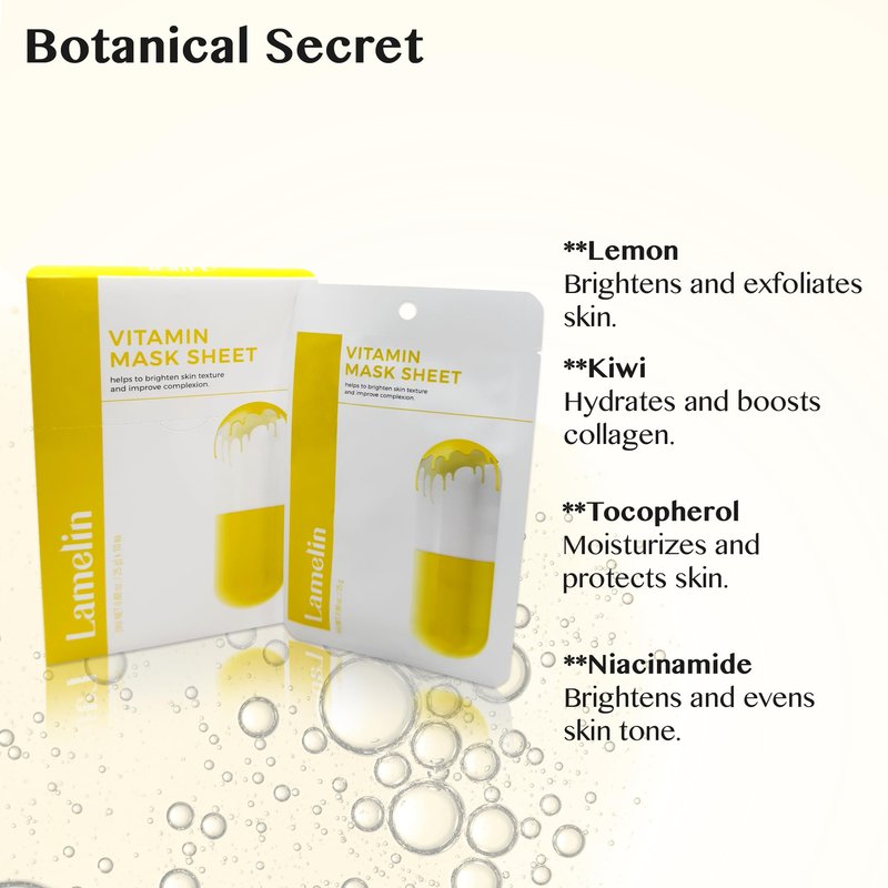 **Unlock Radiant Skin with Lamelin Vitamin Face Mask** Experience the ultimate in skincare with Lamelin's Vitamin C-infused Tencel sheet mask, designed to rejuvenate and revitalize your complexion. Whether you're targeting wrinkles, acne, or dullness, this mask is your secret weapon for radiant skin. **Calm & Rejuvenate Your Skin** Our Vitamin C face mask refreshes tired skin, enhancing its natural glow while providing protection against damage. No matter your skin type, Vitamin C is the multitasking skincare ingredient you need. **Natural Antioxidant Boost** Lemon and Kiwi Fruits Extract infuse this mask with powerful antioxidants that boost vitality and brighten your skin. Essential nutrients combat signs of aging, leaving your skin looking youthful and refreshed. **Restore Glow with Tocopherol (Vitamin E)** Experience the nourishing benefits of Tocopherol (Vitamin E), which refreshes tired skin and enhances its healthy glow. This formulation also protects against future damage from free radicals and sun exposure. **Indulge in K-Beauty Excellence** Treat yourself to our cult-favorite Korean beauty formula. Each mask is crafted with top-quality ingredients to deliver transformative results, making it a must-have addition to your skincare routine. **Effortless Beauty in Minutes** With our 10-pack face mask option, achieving stunning results is easier than ever. Simply apply the mask after cleansing, leave on for 10-20 minutes, then remove and gently pat in the serum for beautifully nourished and revitalized skin. Transform your skincare routine with Lamelin's Vitamin Face Mask and discover the secret to radiant, youthful-looking skin. Whether you're looking to brighten, lift, or cleanse your skin, our mask delivers exceptional results. Experience the power of vitamins and embrace beautiful, glowing skin today.
