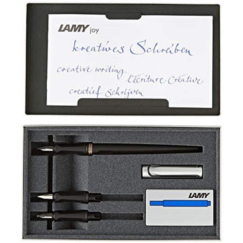 - Contains a LAMY Joy AL fountain pen in black with an aluminium lid and a flexible black clip