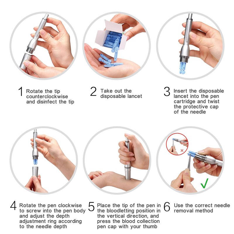 3.According to individual skin, adjust blood lancet pen depth, twist in pursuance of the ring at the top of cap,micro adjust the distance of the cap and needles.