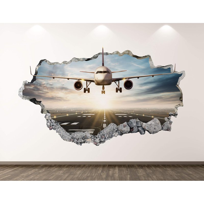 Landing Airplane Wall Decal Art Decor 3D Smashed Airport Plane Sticker Poster Kids Room Mural Custom Gift BL195 (50"w x 30"H)