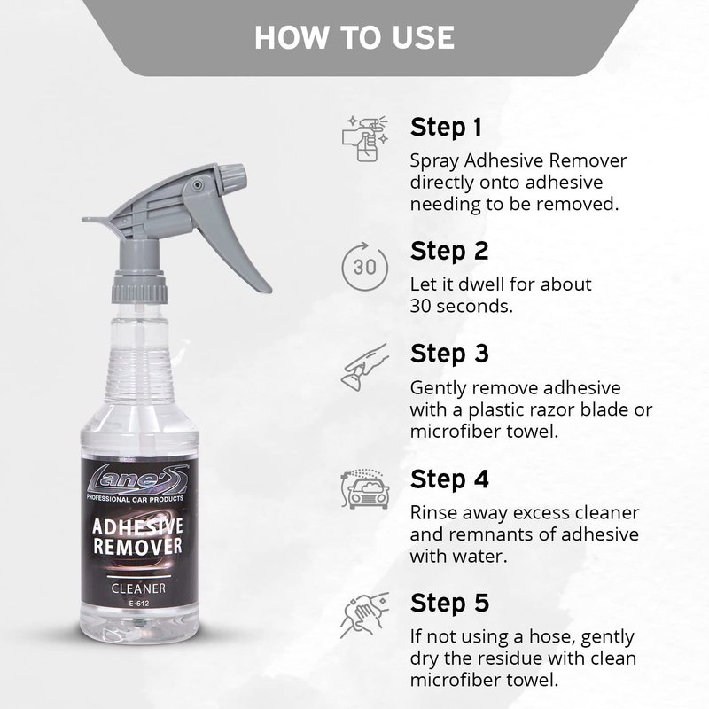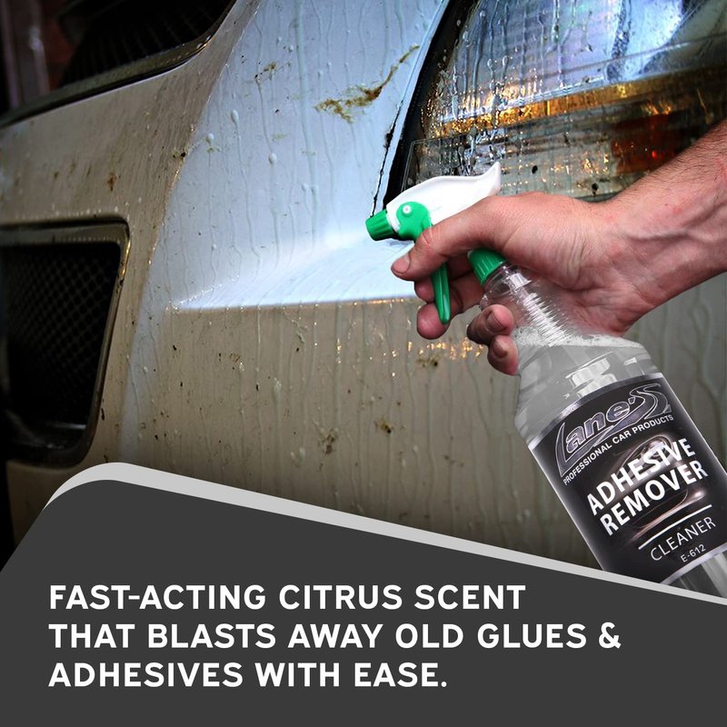 - ADHESIVE SPRAY- Lane’s Adhesive Spray Remover is a quick and effective product that quickly removes stickers, window decals and adhesive from paint, glass and chrome leaving a clean, streak-free finish.