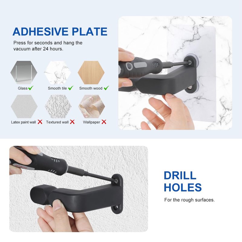 - Easy Installation: Choose between two mounting methods - drilling or using the adhesive plate - to easily install the wall mount on smooth tiles and glass surfaces. (Note:1. Not suitable for wall surface, wallpaper, brick, or non-stick surfaces. 2. Please leave the adhesive plate for at least 24 hours and then hang the vacuum.)