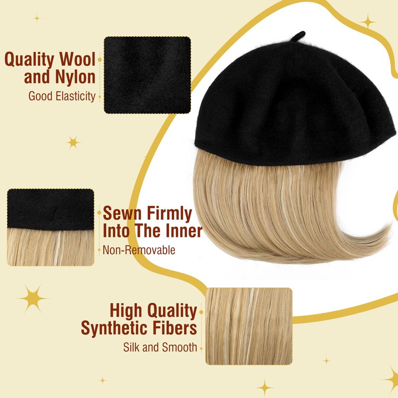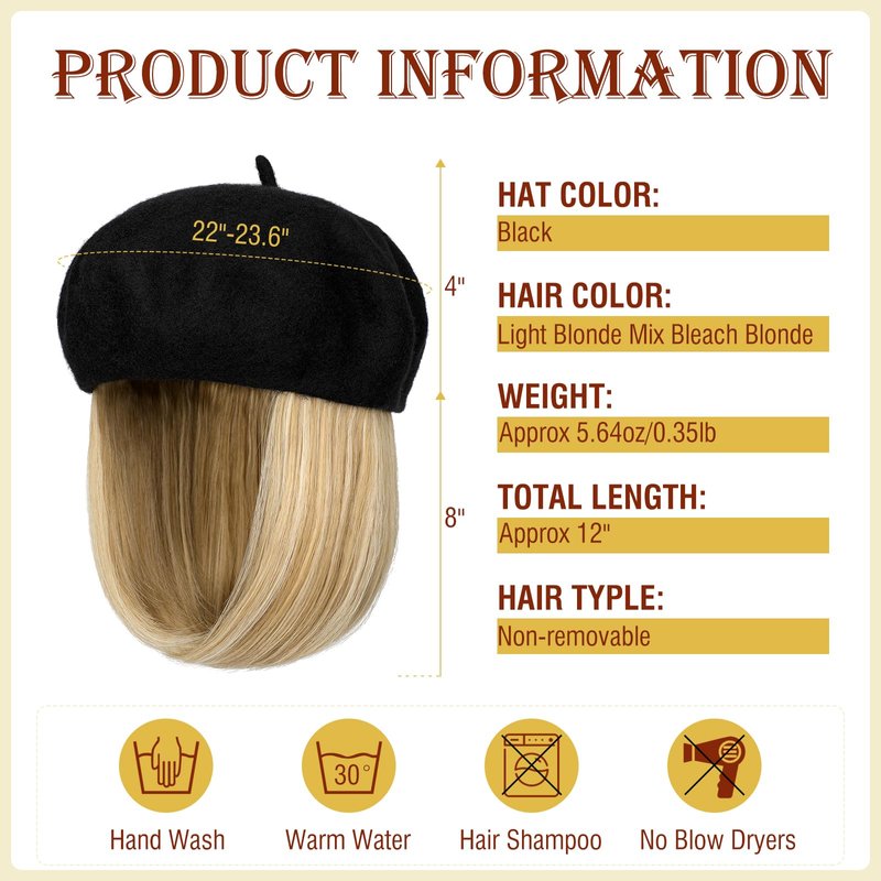Lansigreen Hat Wig Beret Hat with Hair Extensions Classic French Wool Hat Attached 12" Straight Short Bob Hairpiece Synthetic for Women Light Blonde Mix Bleach Blonde