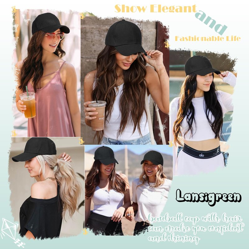 Lansigreen Hat Wig for Women Baseball Cap with Hair Extensions Adjustable Hat Attached 24" Long Wavy Hairpieces Synthetic Wig Dark Black