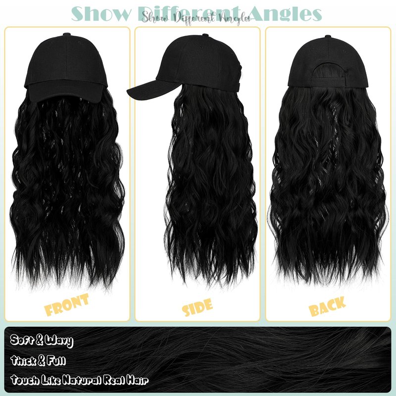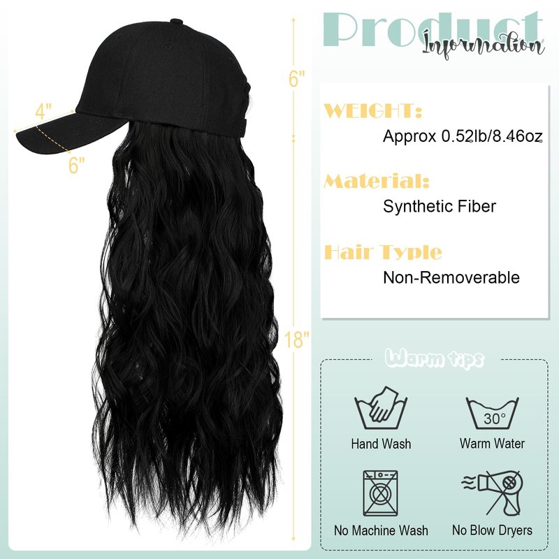 - šćSpecification & MaterialćThe hat wig total length is 24";The hairpiece is 18";Weight about 8.46 oz.Made of 100% high-quality synthetic fibers.Soft touch like natural real hair.The natural wavy hair combined stylish baseball cap change your style and become more confident and charming.Also protects you from sun burn better.