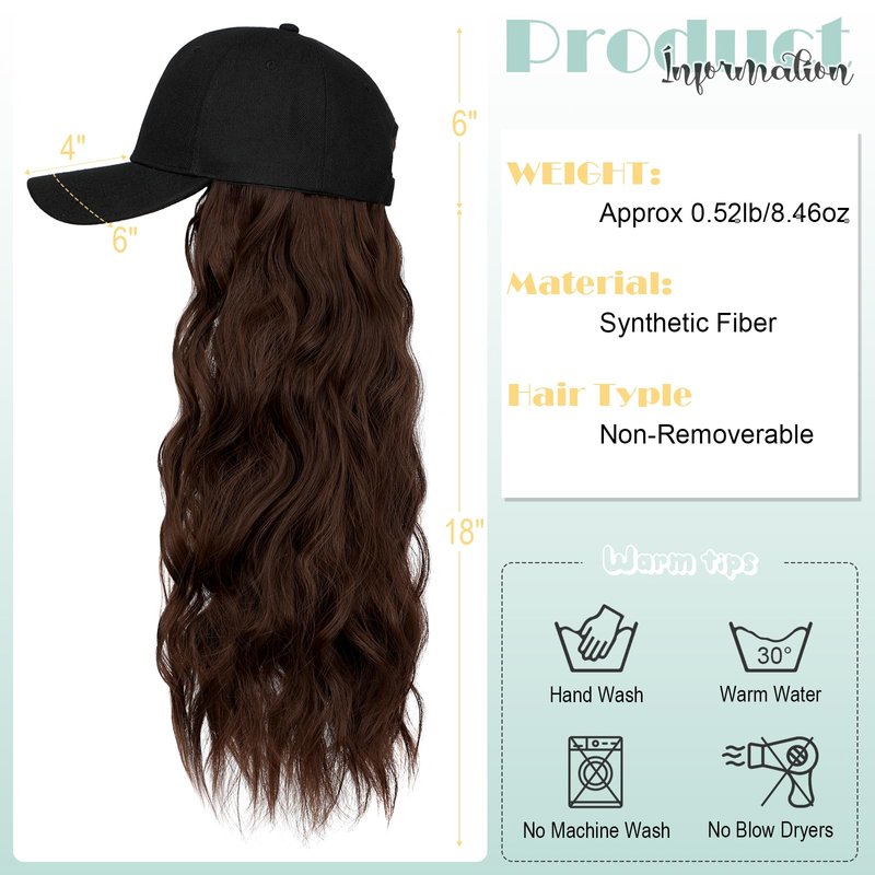 - šćSpecification & MaterialćThe hat wig total length is 24";The hairpiece is 18";Weight about 8.46 oz.Made of 100% high-quality synthetic fibers.Soft touch like natural real hair.The natural wavy hair combined stylish baseball cap change your style and become more confident and charming.Also protects you from sun burn better.