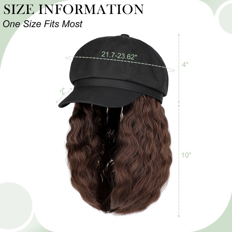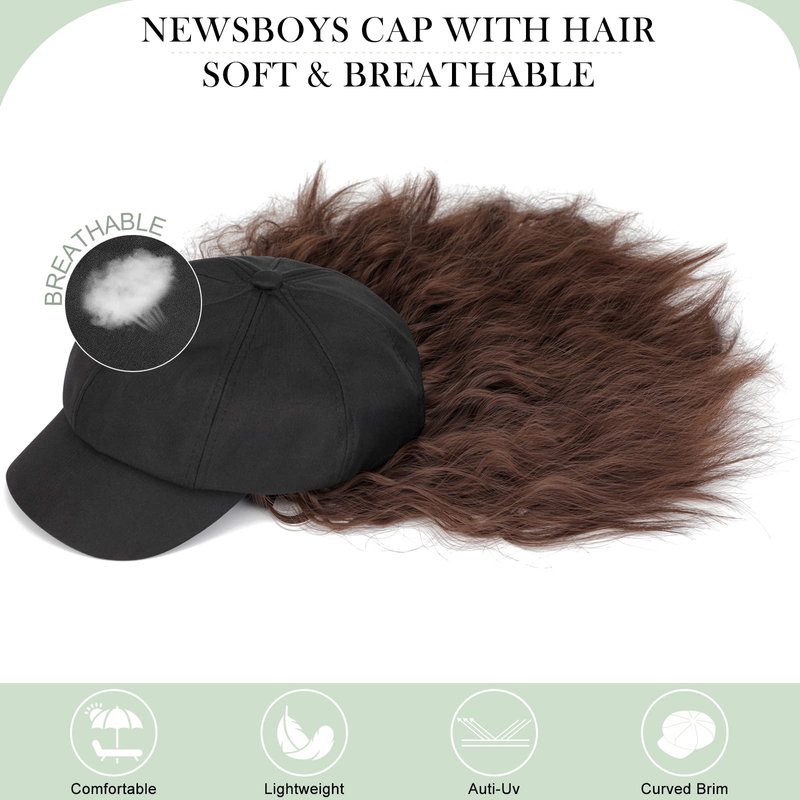 Lansigreen Newsboy Cap with Hair Extensions Short Curly Wavy Bob Hairstyle Wig Hat Beret 8 Panel Attached 14" Synthetic Hairpiece for Women Medium Brown