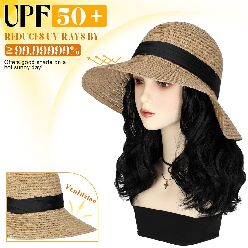 Lansigreen Sun Hat with Hair Extensions Hat Wig UPF 50+ Foldable Wide Brim Straw Beach Hat Attached 9" Wavy Hairpiece Synthetic for Women Summer Dark Black