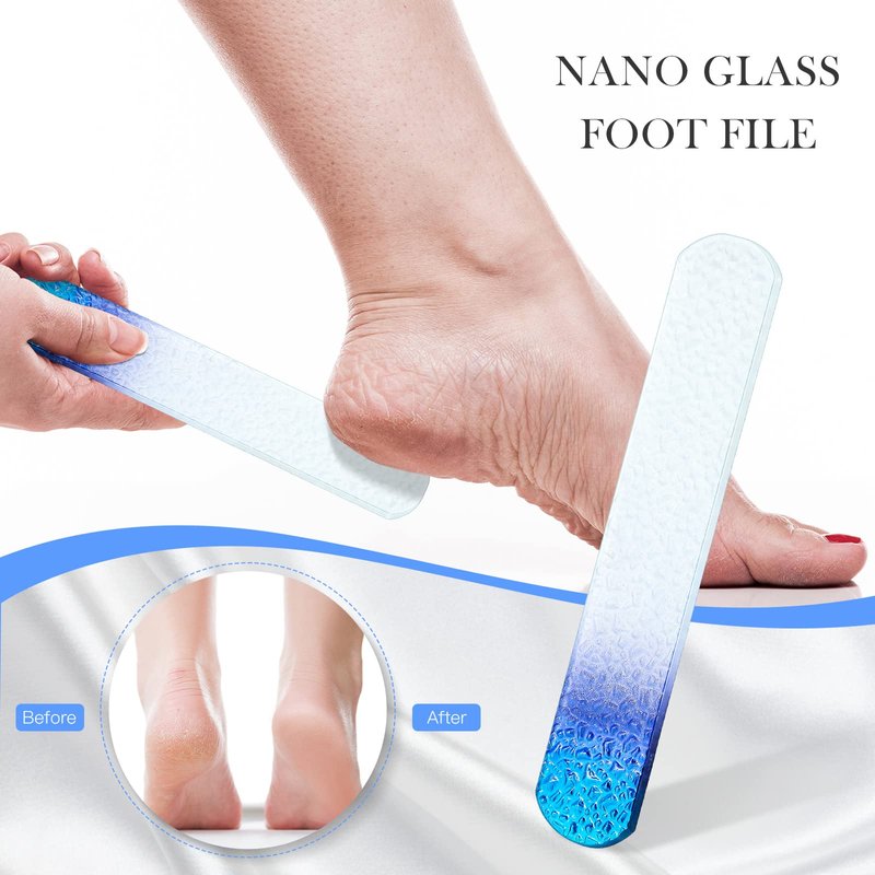 - Multipurpose Manicure tools: the glass fingernail files can be applied to remove nail polish and grind the edges of nails, the glass nail buffer can help smooth the surface of nails, the filing cuticle pusher can be applied to remove dead skin on your hands, and callus remover foot rasp can be applied to grind dead skin around heels