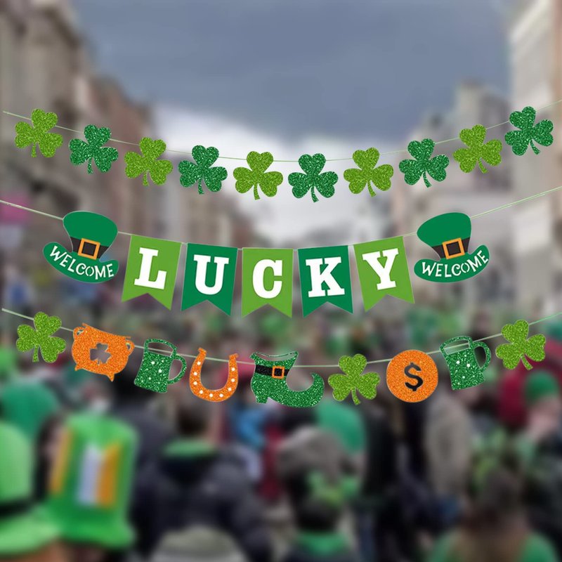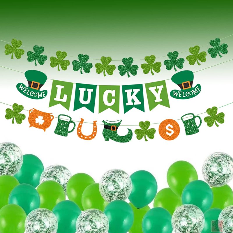 - Package: 1x LUCKY letters banner, 2x shamrock banner.