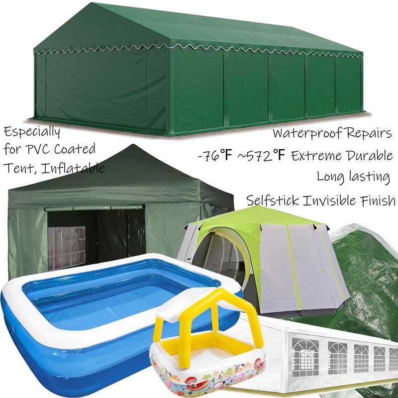 - ✅【Professional Tent Repair Tape】The clear tent repair tape is especially designed for PVC coated tent and similar cloth. PET tape, US gule, it is durable, flexible, waterproof, which can be used for a long time in the temperature range of -76℉ - 572℉, adapt to any weather conditions (rain, snow, wind, sunny, desert, etc.)
