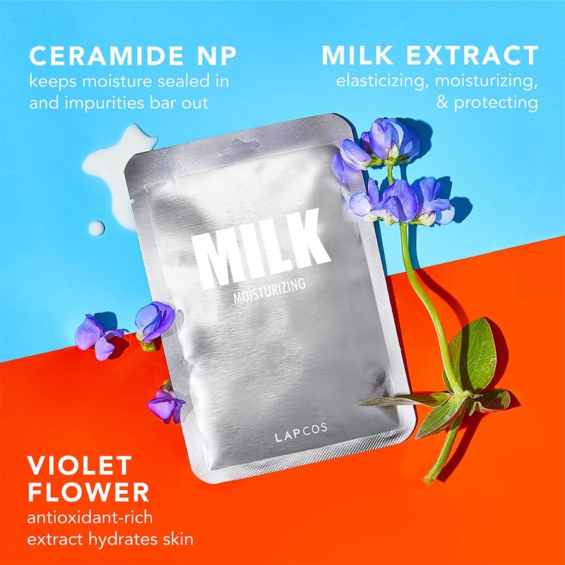LAPCOS Daily Sheet Mask (Milk, 5pk) - A moisturizing microfiber sheet mask powered by Milk Protein, Ceramides + Violet Flower. Leaves your skin feeling… dewy like the creamy essence of milk.
