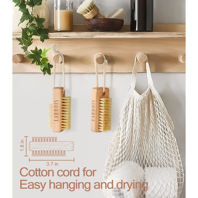Larbois Nail Brush for Cleaning Fingernails, 2Pack Wooden Nail Brushes Fingernail Brush for Cleaning Nail Scrub Brush Two-Sided with Hanging Rope (Beechwood)