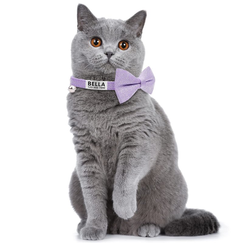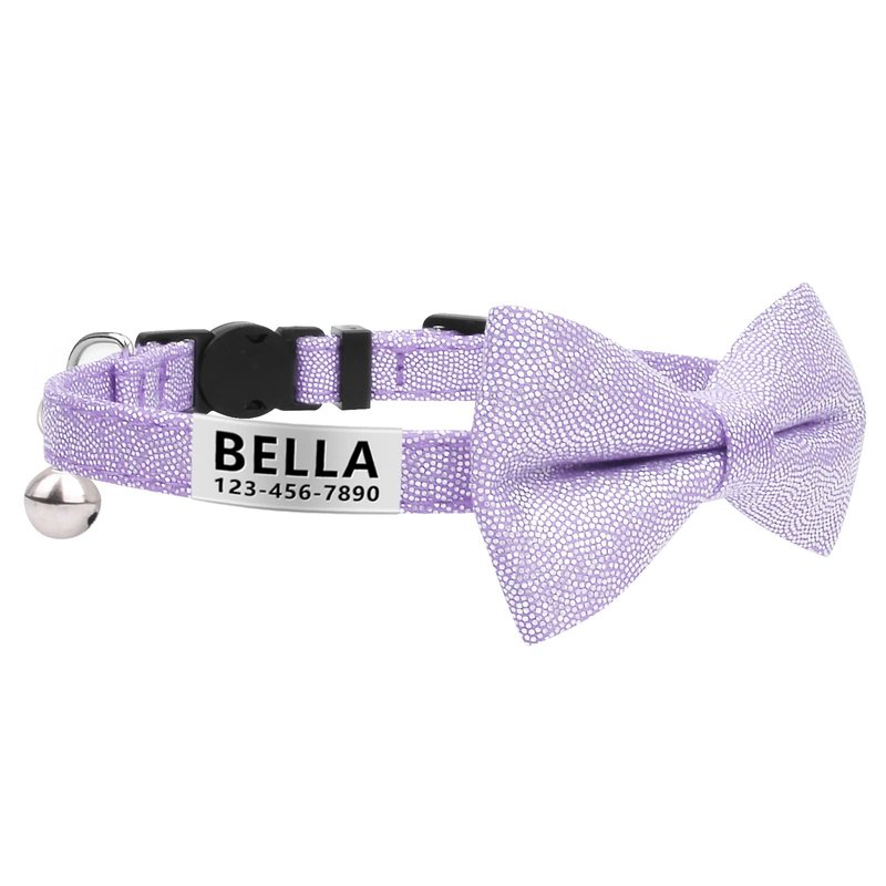 LaReine Personalized Breakaway Cat Collar with Bell & Bow Tie, Stainless Steel Slide-on Pet ID Tag Engraved with Name & Phone Numbers, (Customized - 7"-11" Neck, Bling Purple)