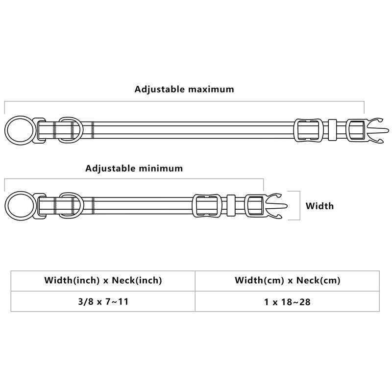 - adjustable cat collar design; Neck 7"-11", Width 3/8";