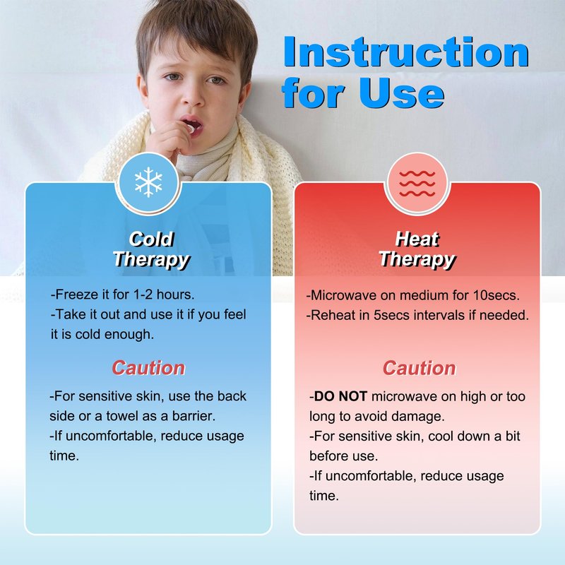 - How to Use: Freeze for 1-2 hours for cold therapy. Good as cold packs for injuries. For heat therapy, microwave for 10 secs on medium power, reheat in 5-sec intervals if needed. Always check the temperature before use to avoid overheating or damage