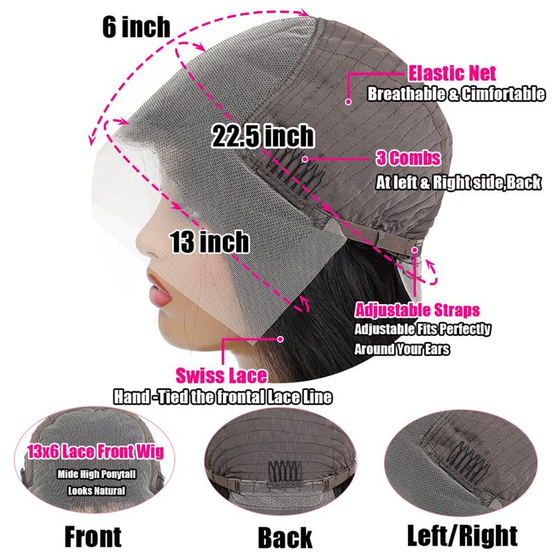 - 4.HD Lace Frontal Wig 13x6 Cap Size: Body Wave Glueless Wig Human Hair Easy to install and take off, 22.5" Medium Cap (average size) with 4 Combs and Adjustable Straps, Easy to Adjust, Fits for Most Customers Perfectly. Also Have a Wide Elastic Band Inside, Not Easy to Fall Off, Secure and Comfortable Fit and More Convenient for Daily Wear.