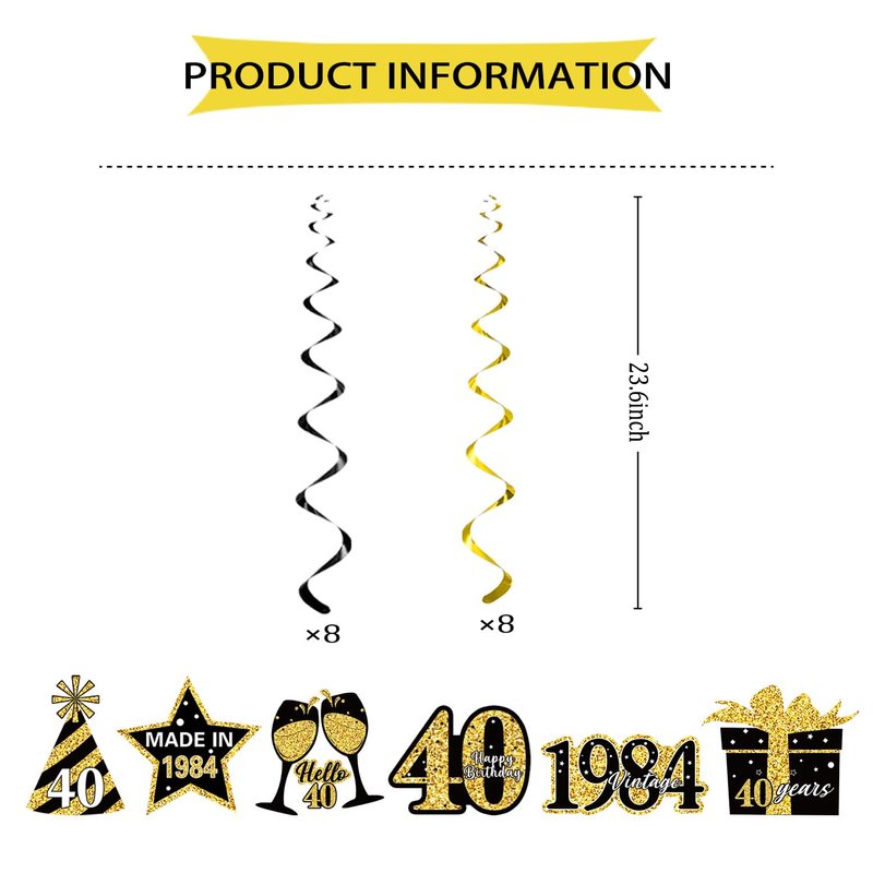 - 【QUALITY MATERIAL】The party swirl decorations are made of quality card paper with double-sided printing, they are not flimsy and easily bent. The party foil material swirl decorations come in black and gold styles; These 40th birthday party hanging swirls are durable enough to be applied many times on different occasions
