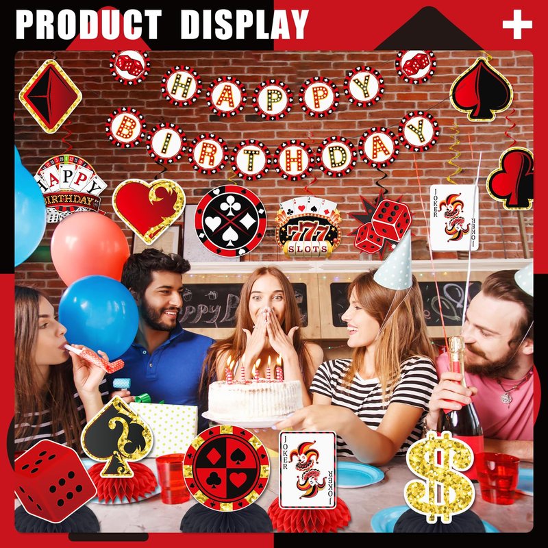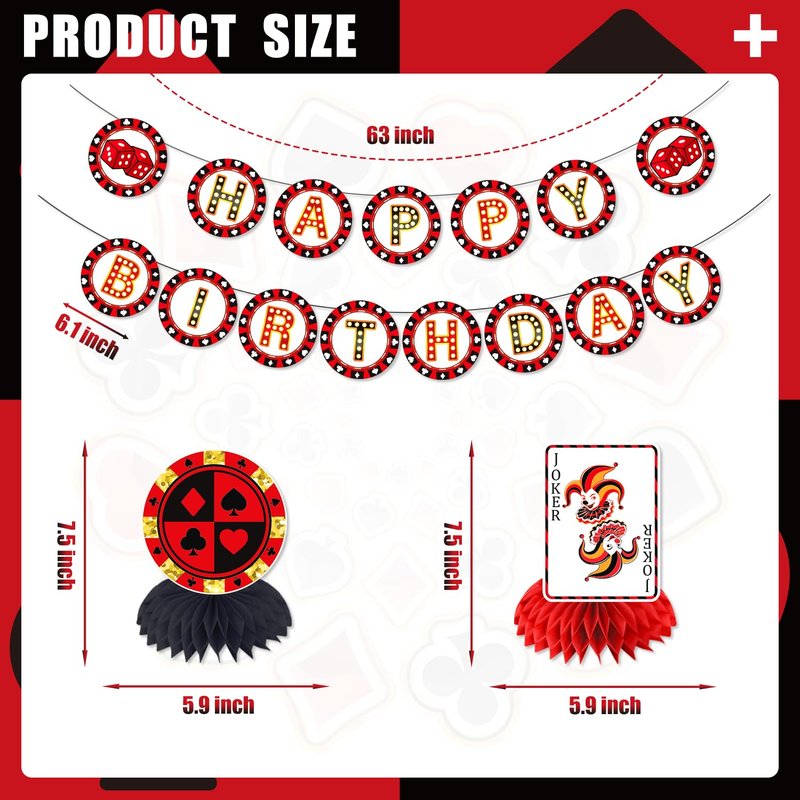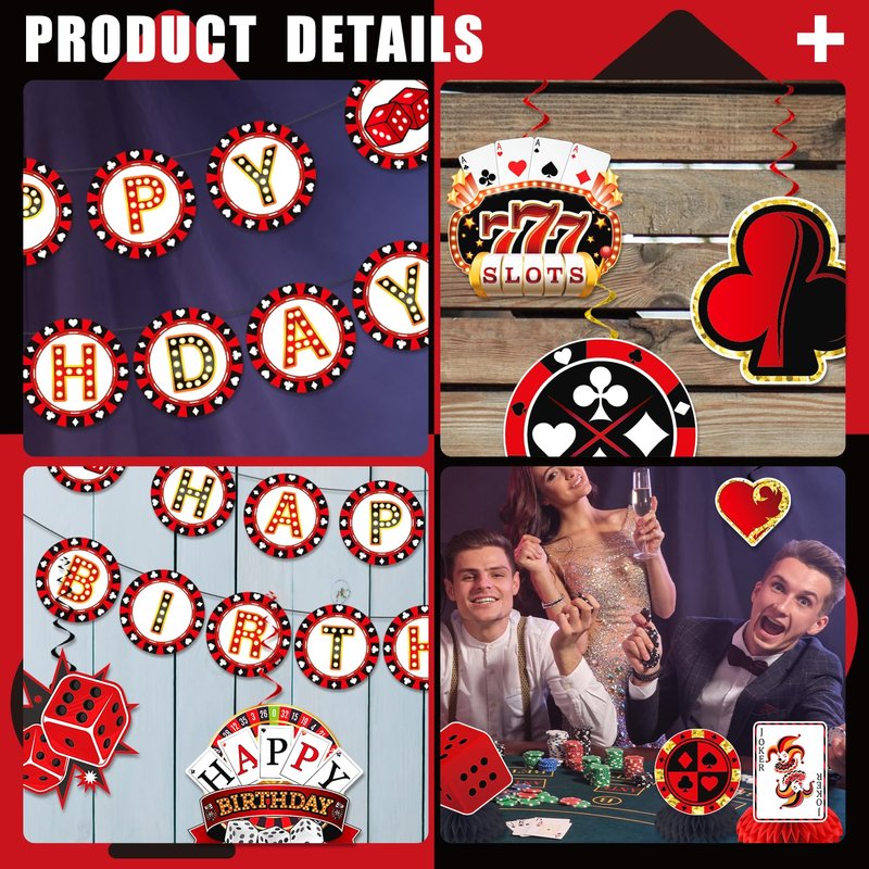 - 【CASINO THEME DESIGN】These decorations are featured with casino party styles and elements, including playing card, dice and more, vivid and classic, so you can choose and match according to your preference, easily throwing a desired party