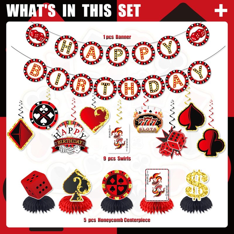- 【PACKAGE INCLUDES】Casino themed party decorations includes 1pc rock and roll banner, 9pcs hanging swirls and 5pcs honeycomb centerpieces. They will accentuate your party style and add to the party vibe, and they'll be a fun and attractive addition to your party