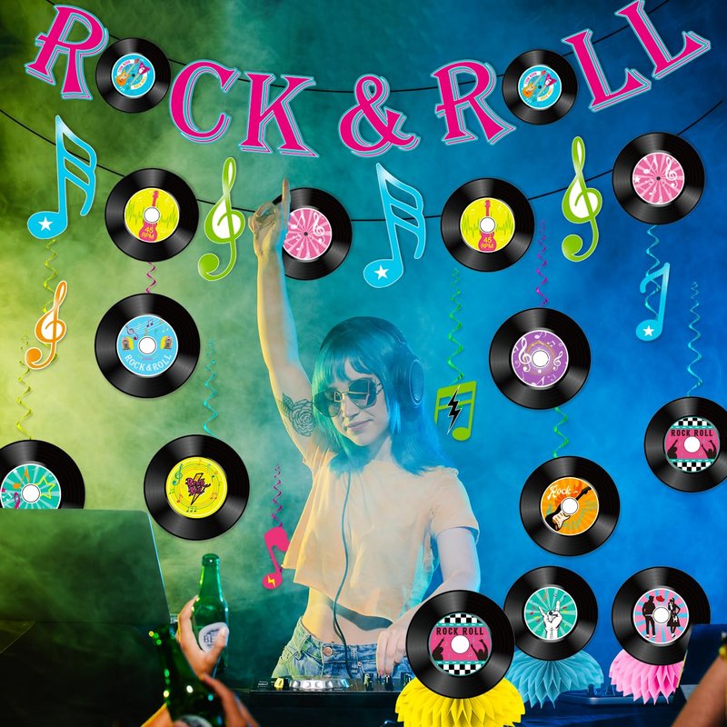 LARRAZABAL Rock and Roll Birthday Party Decorations, Music Themed Party Decorations Include Rock and Roll Banner Hanging Swirls Honeycomb Centerpiece 50s Party Decorations Baby Shower Supplies