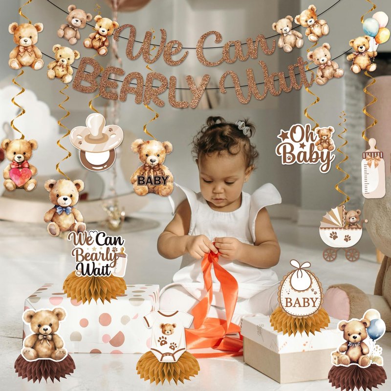 LARRAZABAL We Can Bearly Wait Baby Shower Decorations, NO-DIY Bear Banner Hanging Swirls and Honeycomb Centerpiece, Baby shower Decorations for Boy Bear Birthday Party Supplies